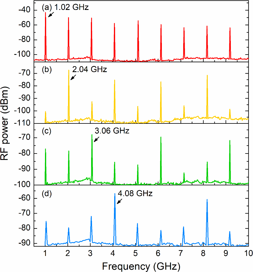 针对以上问题,sunbet申搏官网超快激光技术与应用研究中心采用自行研制的10 W级GHz重复频率克尔透镜锁模Yb:CYA激光振荡器作为泵浦源,实现了瓦量级多GHz重复频率的飞秒OPO运转。OPO输出信号光的波长调谐范围为1.41–1.64 μm,最大平均功率1.58 W,最短脉冲宽度139 fs,重复频率1 GHz;中红外闲频光的波长调谐范围为2.8–4.0 μm,最大平均功率1 W,最短脉冲宽度103 fs,重复频率1 GHz。通过调整腔长,分别获得了2 GHz、3 GHz和4 GHz重复频率的信号光输出,各重复频率下输出功率均超过1 W。据我们所知,该成果实现了目前GHz重复频率飞秒OPO的最高功率输出。相关成果发表在Opt. Lett. 50, 2453-2456 (2025)。论文第一作者为团队青年教师同晖,合作单位包括陕西理工大学、上海交通大学、中山大学和中国科公司物理研究所。