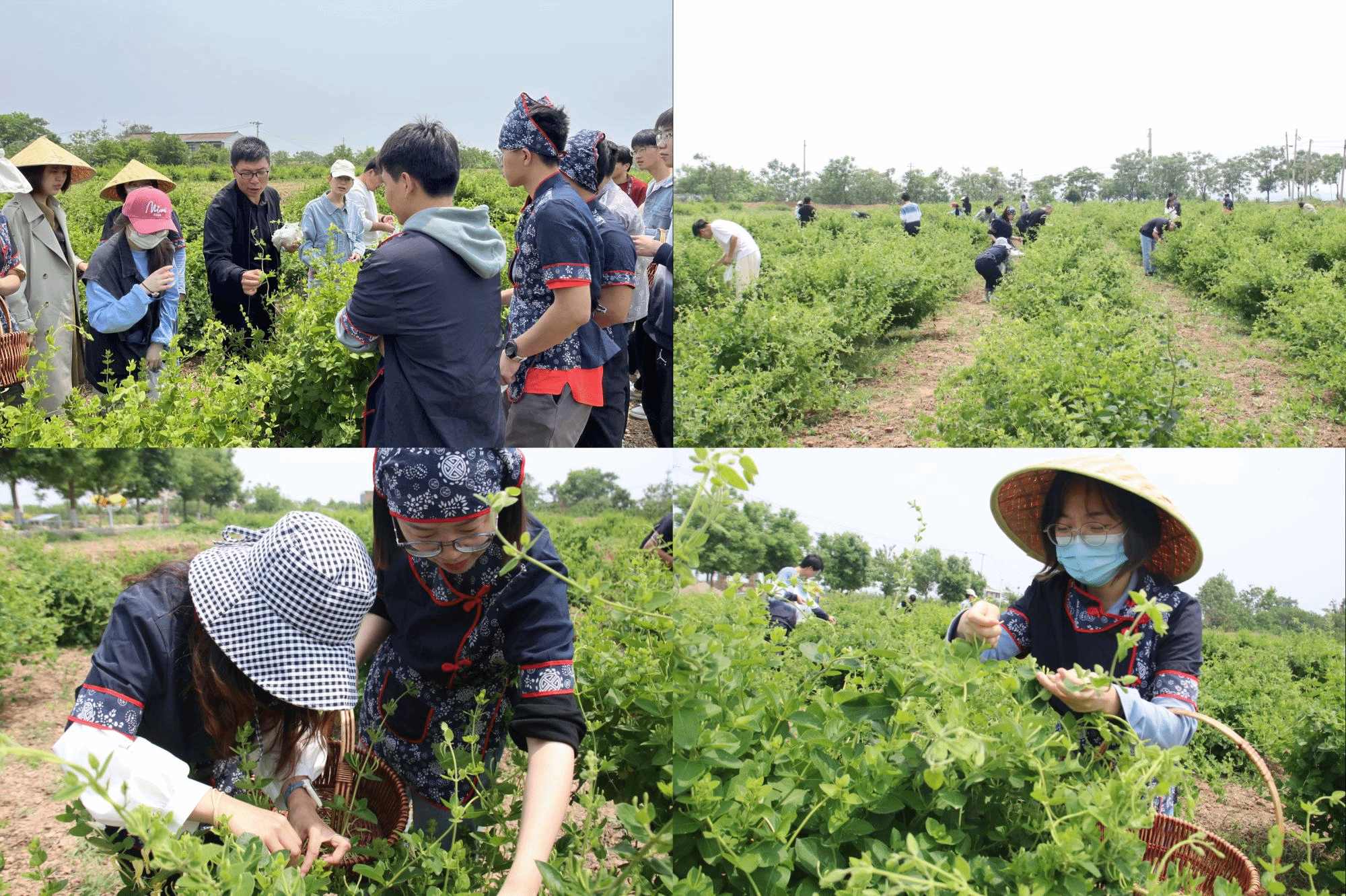 历经3小时车程,公司师生一行抵达了位于蒲城县尧山镇闫家村的金银花采摘基地。公司驻村干部、尧山镇闫家村第一书记韦帅首先介绍了金银花的生长习性、种植技术以及作为药材的功效与作用,然后对如何挑选成熟优质的金银花和采摘方法与技巧进行了详细的讲解。五月的天气,阳光明媚、温度适宜。同学们穿上特色服饰、拿上竹篮走进金银花田。采摘中,同学们分组竞赛,认真挑选,细细体会劳动的魅力。采摘看似容易,实则很不寻常。 “作为一名合格的采摘者,需要准确挑选适合采摘的金银花,保持采摘的速度,同时还要保证花朵不受损伤”,基地的工作人员讲到。初次体验的同学们动作虽然生疏,但经过半小时的采摘,手中的竹篮也已被青白色的金银花铺满。