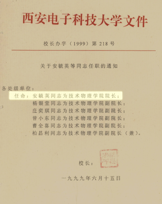 1999年安毓英任职为技术物理公司经理的通知(西电档案馆馆藏)