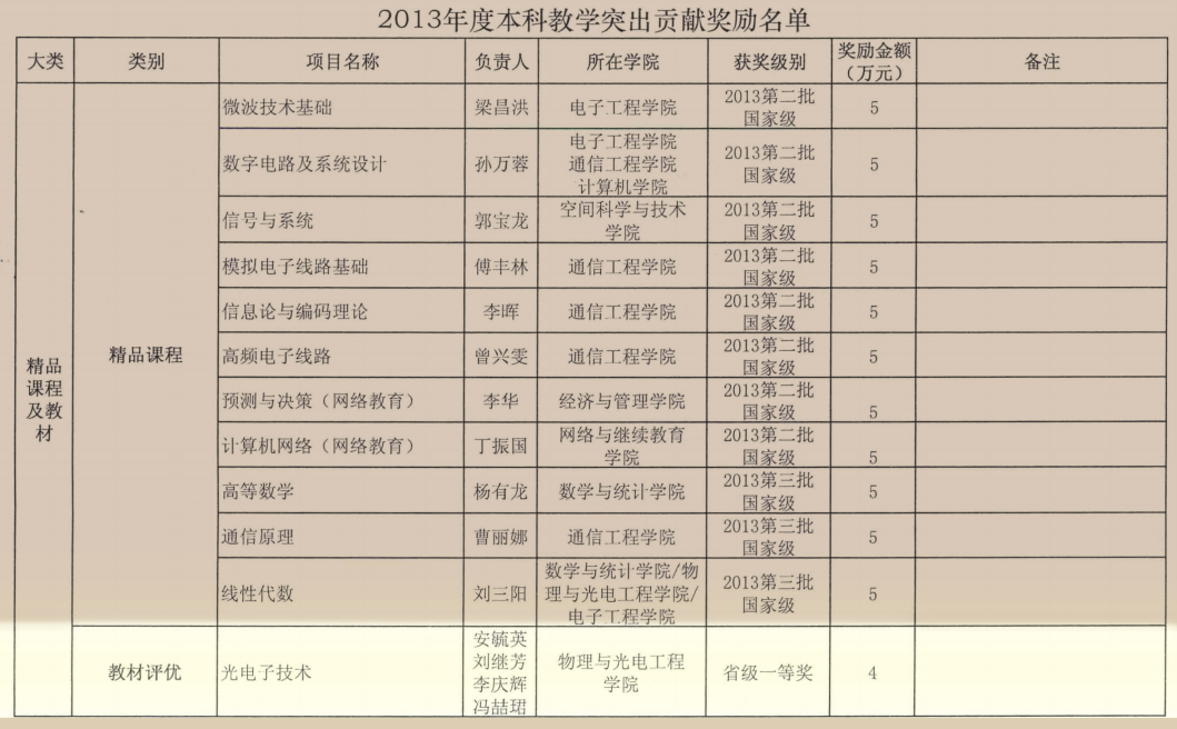 《光电子技术》获2013年度本科教学突出贡献奖(西电档案馆馆藏)