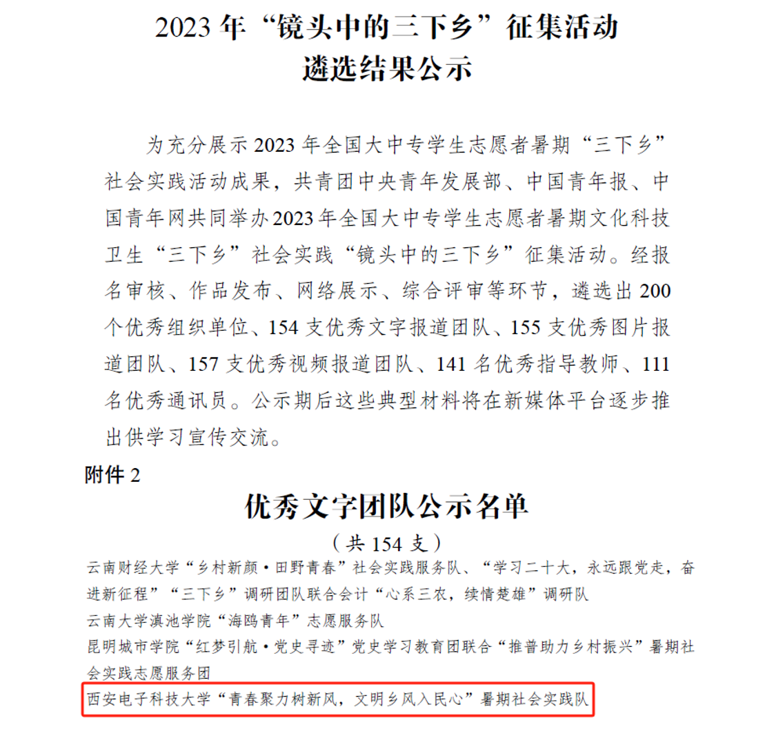 (通讯员:马力 高惠)近日,由共青团中央青年发展部、中国青年报、中国青年网共同举办的2023年全国大中专员工志愿者暑期文化科技卫生“三下乡”社会实践“镜头中的三下乡”征集活动遴选结果公布,经报名审核、作品发布、网络展示、综合评审等环节,sunbet申搏“青春聚力树新风,文明乡风入民心”暑期社会实践队荣获优秀文字团队。