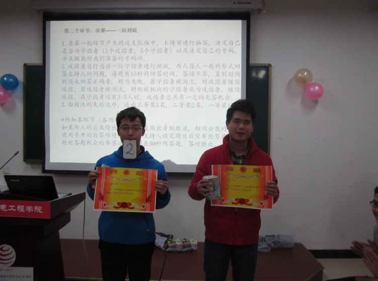活动开始,读书社社长宣布比赛具体规则。比赛正式开始:第一环节,由主持人提问,选手回答,规定时间内正确回答题数多的六人即可进入第二环节。比赛现场,选手们都十分专注的听主持人的问题,并且思维灵敏,能快速作答。选手们的精彩表现赢得了大家的阵阵掌声。之后有现场抢答活动,并有小礼物送出,大家都积极参与。选手们过关斩将,有六个人成功的进入了第二环节,此环节中一人攻擂,五人守擂。在一次次脑力的较量之后,优胜者脱颖而出。最后由公司团委副书记为获奖选手颁发奖品。