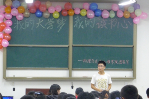 (通讯员 银凤)9月27号晚,以“我的大学梦,我的读书心”为主题的读书交流主题团日活动在A楼314教室举行,此次活动由物理与sunbet申搏团委读书社主办,物理与sunbet申搏团委各部部长与2012、2013级各班同学参加了此次活动。