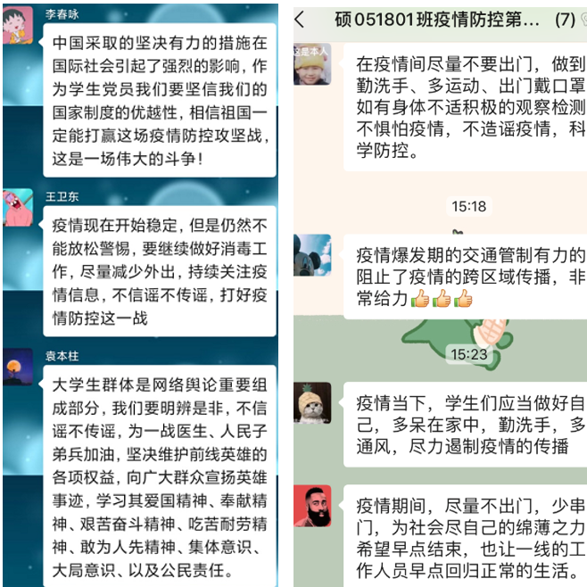课后,研究生针对课程内容积极交流,各研究生党支部就 “疫情期间,火线入党”、“向支部参与抗疫志愿工作的党员先锋学习”,“疫情防控期间支部‘三会一课’工作开展”,“疫情期间党支部建设特色做法”等相关内容展开了热烈讨论。在各班防疫小组的交流中,“身边的抗疫英雄”、“疫情防控小贴士”、“疫情中的焦点社会问题”,“保持乐观情绪,排解毕业压力”、“同心协力,战‘疫’必胜”等成为了关注度高,参与广泛的话题。大家在讨论交流中,广开思路,各抒己见,相互勉励,让还未开学的党支部、班集体在互联网中紧紧地凝聚在一起。在学习中,大家进一步加强了对“四个自信”的理解和体会,纷纷谈到党中央在疫情攻防战中的全面领导指挥和果断正确决策是开创目前防疫良好局面的关键。充分认识到了中国特色社会主义制度在攻坚克难办大事上的无往不利,充分了解到了中国共产党员在战“疫”工作中的先锋带头作用,充分感受到了中华民族在艰苦卓绝中坚韧顽强的民族精神。