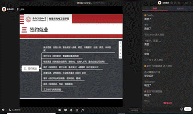 袁本柱首先为同学们分析了电子信息科学与技术、电波传播与天线两个专业当前的就业形势,以及往届毕业生的就业去向,为同学们提供了对口企业和参考岗位。随后,他结合该专业毕业学分以及学位授予要求,回答了同学们关于课程重修、英语复习等问题,他亲和的语气和专业负责的工作态度赢得同学们连连点赞,直播间评论区互动频繁。最后,袁本柱将3月9日召开的“空中双选会”相关情况进行说明,鼓励同学们提早注册投递,主动联系企业洽谈,争取更多应聘机会。