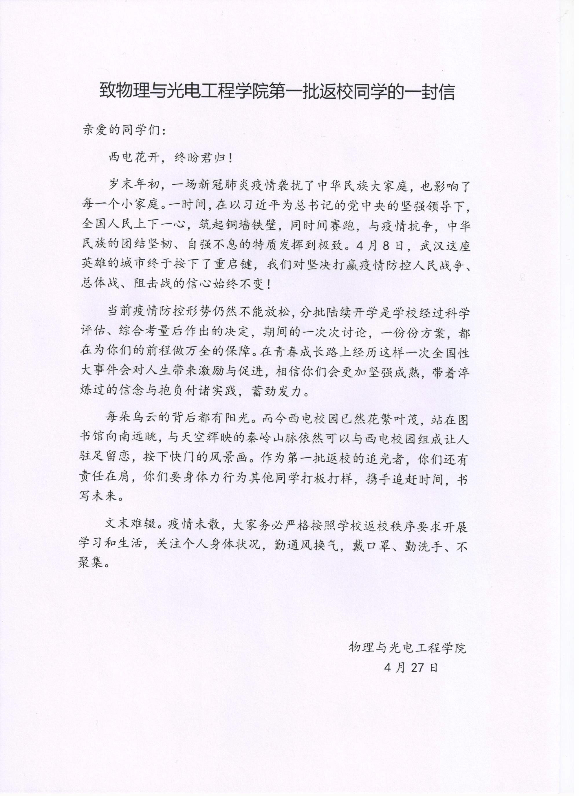 “每朵乌云的背后都有阳光。而今西电校园已然花繁叶茂,站在图书馆向南远眺,与天空辉映的秦岭山脉依然可以与西电校园组成让人驻足留恋,按下快门的风景画。作为第一批返校的追光者,你们还有责任在肩,你们要身体力行为其他同学打板打样,携手追赶时间,书写未来。”电子科学与技术专业刘玉杰在读到这里时深深地感受到公司给返校员工给予的关爱和支持。