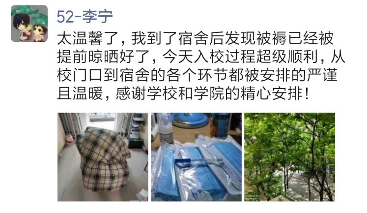 (通讯员 田宪)“太温馨了,我到了宿舍后发现被褥已经被提前晾晒好了,今天入校过程超级顺利,从校门口到宿舍的各个环节都被安排的严谨且温暖,感谢公司和公司的精心安排!”16级电子信息科学与技术专业员工李宁在入校后第一时间在朋友圈分享了自己的感受。
