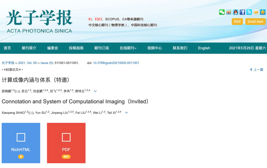 (通讯员:范雪琦 袁本柱)近日,sunbet申搏官网物理与sunbet申搏邵晓鹏教授课题组受邀在《光子学报》2021年第5期发表了题为“计算成像内涵与体系”的封面文章。《光子学报》是中国科公司中国光学学会主办、科学出版社出版的学术月刊,该刊曾多次获得中国国际影响力优秀学术期刊、陕西省科技期刊精品期刊等称号。目前已被EI、ESCI、SA/INSPE、CSCOPUS、CA等数据库检索收录,也是中文核心、中国科技核心及CSCD来源期刊。