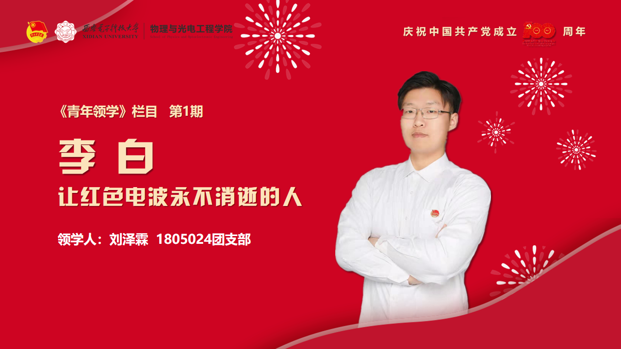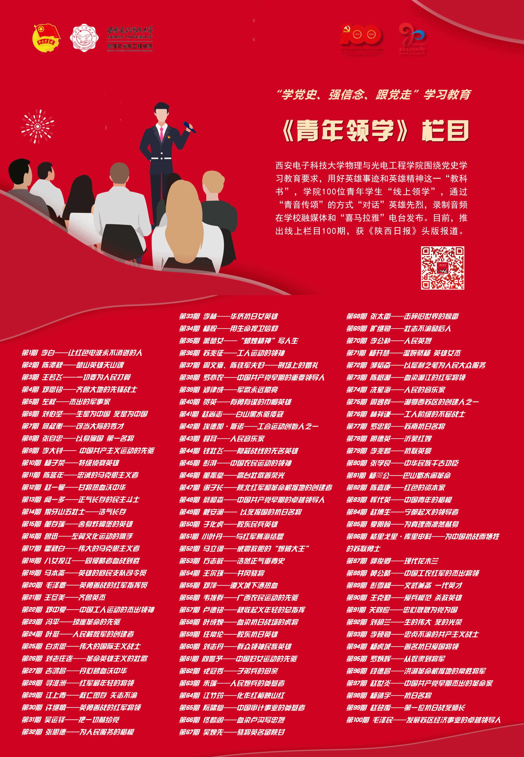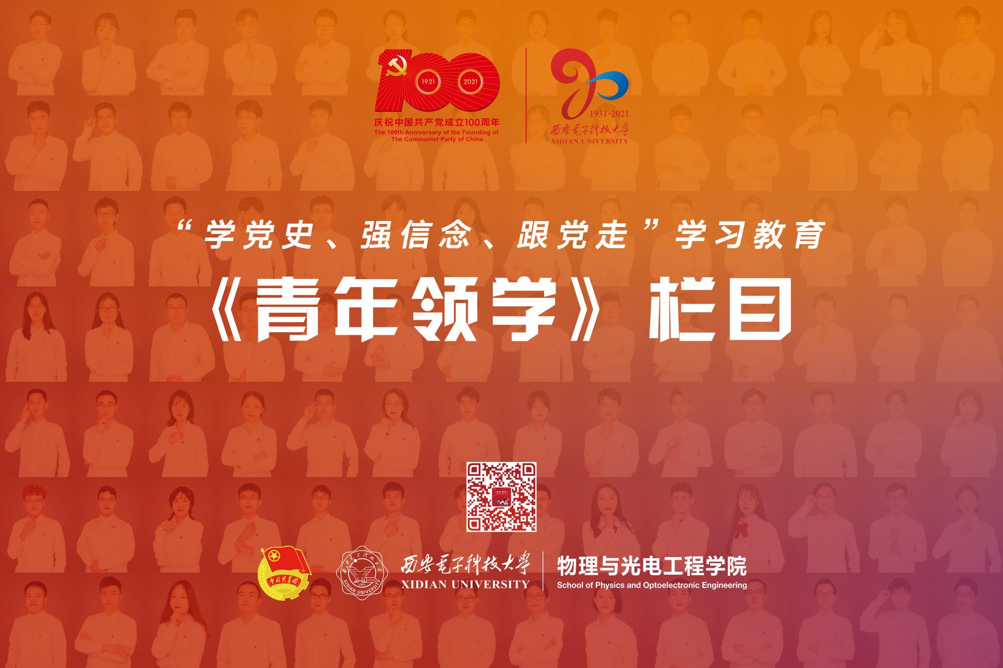 编者按:为庆祝中国共产党成立100周年,深入学习贯彻习近平总书记在党史学习教育动员大会上的重要讲话精神,落实团中央“学党史、强信念、跟党走”学习教育要求,引领广大团员青年厚植爱党、爱国、爱社会主义的情感,物理与sunbet申搏紧紧围绕学史明理、学史增信、学史崇德、学史力行,重点突出“英雄”主题,用好英雄事迹和英雄精神这一“教科书”,依托“西电物光院”官方微信和“喜马拉雅FM”电台推出《青年领学》栏目,教育引导广大青年同“英雄”对话,激发青年员工的责任担当,进一步增强“四个意识”、坚定“四个自信”、做到“两个维护”,以实际行动迎接建党100周年。