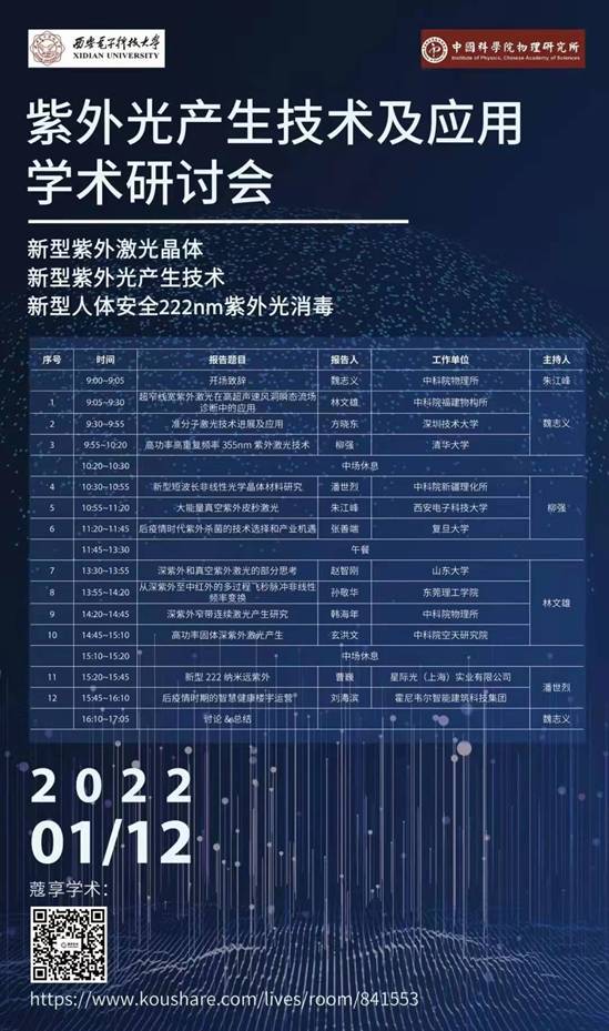 我国在新型紫外激光晶体、新型紫外光产生和新型人体安全222nm紫外光消毒等紫外光相关的领域具有世界领先的科技,不少成果也实现了转化应用。为了进一步探讨并挖掘紫外光产生技术及在灭菌杀毒、疫情防护等方面的应用,2022年1月12日,sunbet申搏官网联合中科院物理所举办“紫外光产生技术及应用研讨会”。研讨会针对紫外光的产生、紫外激光晶体技术以及紫外激光在消毒杀菌和智慧健康等领域的应用,邀请国内多个科研院所和科技企业进行交流讨论。星际光(上海)实业有限公司作为新型紫外光运用领域的领先企业,已将222纳米紫外光用于新冠消杀领域,作为嘉宾参加本次研讨会。