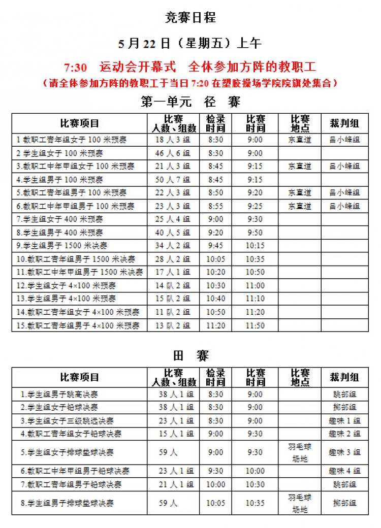 “sunbet申搏官网2015年教职工运动会”将于本周五、六两日(5月22、23日)在新校区塑胶操场举行,现将《赛程安排》公布如下,请各系室工会组长通知各位选手(参照《西电科大运动会物光院参赛名单》,查看网址:http://stp.xidian.edu.cn/view-1194.html)提前做好参赛准备,着公司统一运动服按时参赛,同时,也鼓励未参赛教职工前来观看,为公司加油打气!请相互转告。