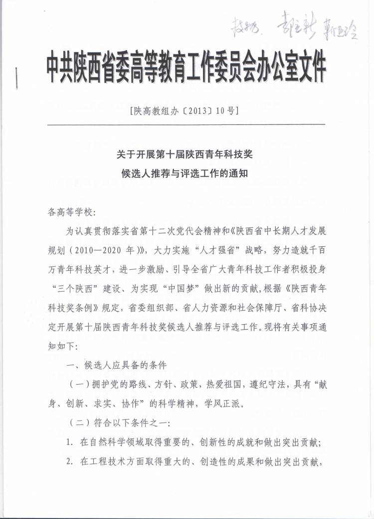 关于开展第十届陕西青年科技奖候选人推荐与评选工作的通知