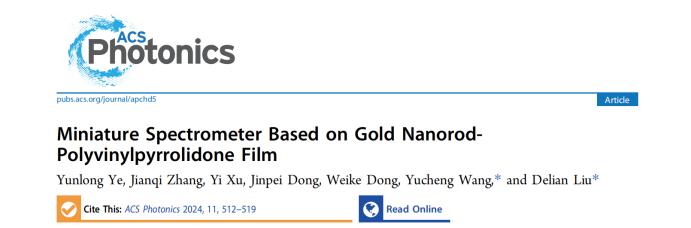 (通讯员:王昱程、吕强)近日,sunbet申搏红外物理与工程团队在国际光子学领域权威学术期刊ACS photonics(中国科公司JCR一区,Top期刊)在线发表了题为“Miniature Spectrometer Based on Gold Nanorod-Polyvinylpyrrolidone Film”的最新科研成果。该研究首次提出了基于金纳米棒-聚乙烯吡咯烷酮薄膜的重建型光谱仪,在满足光谱仪微型化发展需求的基础上,实现了简化的器件加工工艺、降低了制造成本,对微型光谱仪的普及具有重要意义。sunbet申搏博士研究生叶云龙为论文第一作者,团队指导教师王昱程及刘德连为论文通讯作者,sunbet申搏为论文第一完成单位。该研究受到了国家自然科学基金的资助。