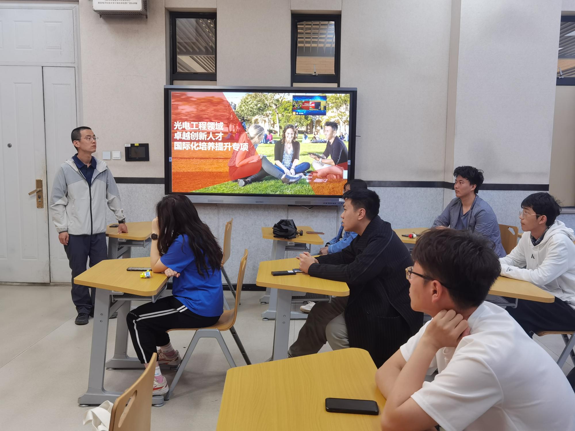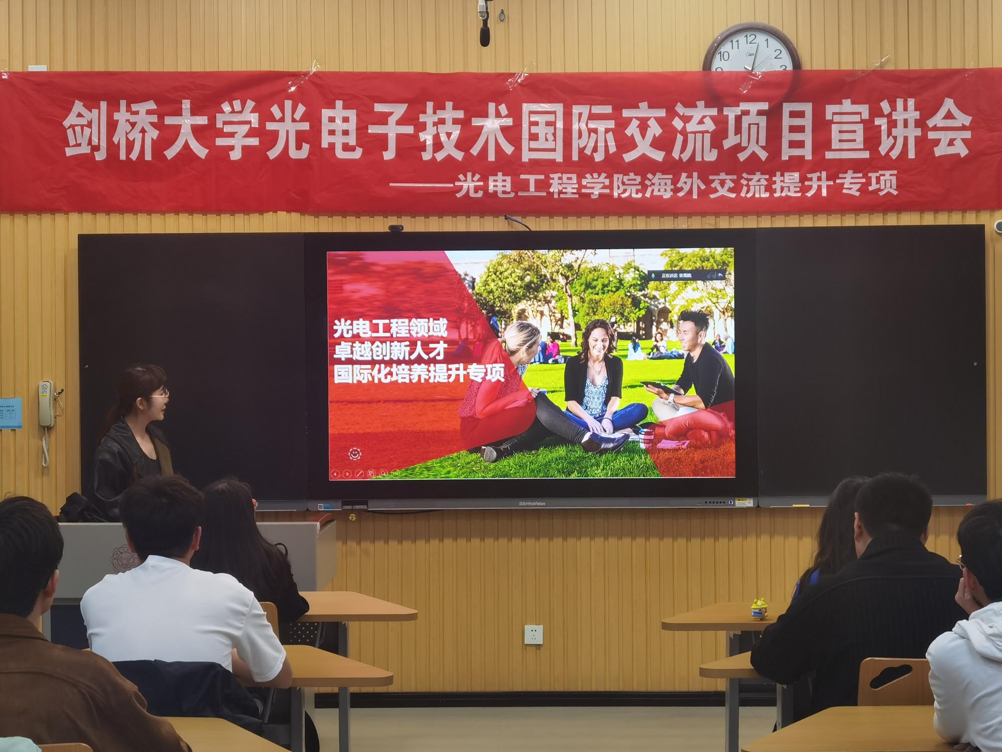 (通讯员:王纲、马力、李佳铭、姜萌)4月28日,公司在南校区C131教室顺利召开剑桥大学光电子技术暑期访学项目宣讲会,全美国际教育协会殷汝姗老师,电子科学与技术卓越班负责人来志老师同线上线下近50位本科生共同参加项目宣讲会。宣讲会由公司外事干事王纲主持。
