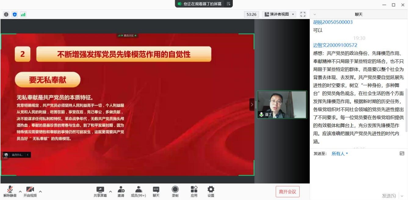 聂丁老师以陈清洲、杜富国等前辈为例,从“与时俱进是共产党员发挥先锋模范作用的迫切需要”、“严于律己是发挥先锋模范作用的有效途径”等两个方面说明了深刻发挥先锋党员模范作用的重要性。