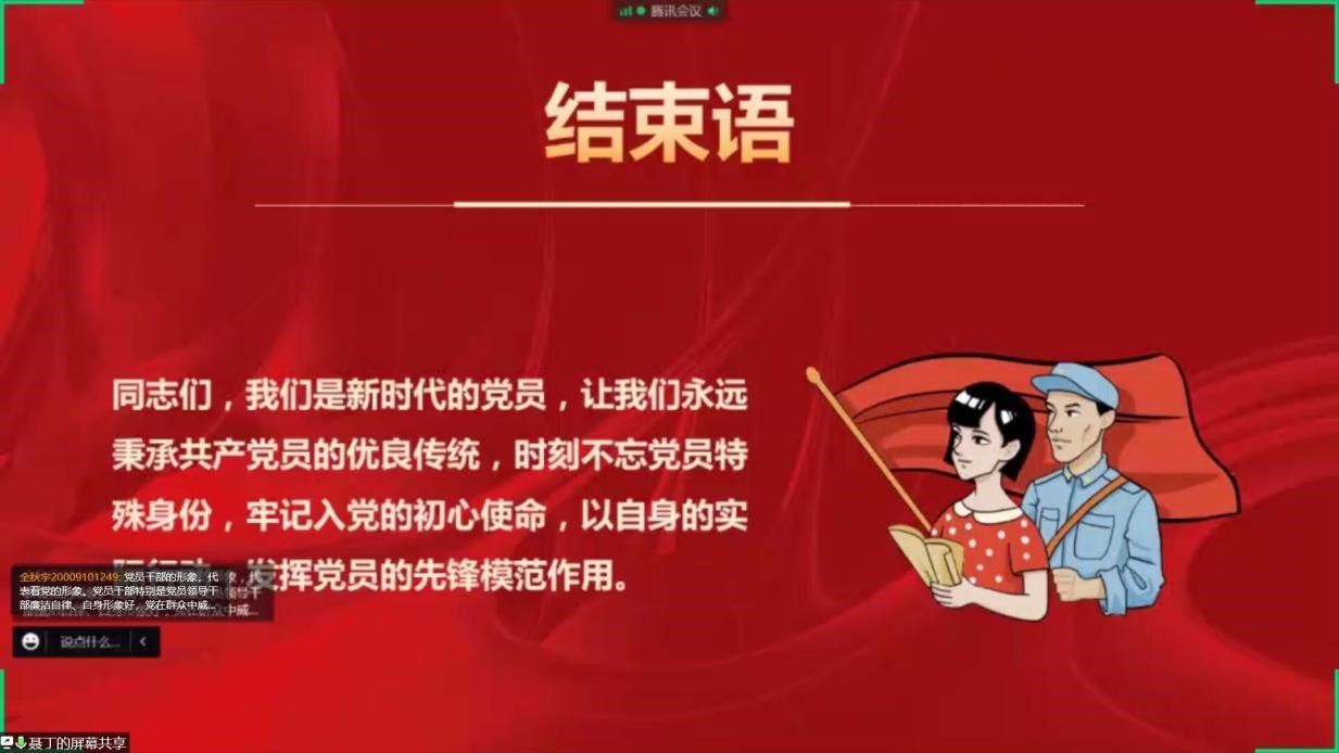 2005019支部候塞金提到,聂丁老师先通过孙家栋、杜富国等人的事迹说明了先锋模范作用的极端重要性,深深地感召了我,党员是中国人民的先锋队,无论在什么时刻,党员应该永远站在第一线。“中国共产党”不仅仅是一个身份,更是“能打胜仗,作风优良”的行动,一份“广大人民群众利益为先”的责任,一种“共产党员冲在前”的精神。听完聂老师的党课报告,我今后一定发奋学习,只争朝夕,当好先锋,争取早日成为党旗下的共产党员!