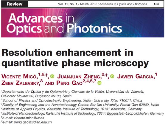 (通讯员:郜鹏)近日,Advances in Optics and Photonics (AOP)刊登了西电物光院郑娟娟博士与西班牙Valencia大学Mico教授一起受邀撰写的长篇综述文章“Resolution Enhancement in Quantitative Phase Microscopy”(80页)。Advances in Optics and Photonics (AOP)是美国光学学会下的旗舰期刊(属SCI/EI检索、物理类I区,影响因子:21.28),该期刊旨在系统报道光学、光子学领域内的科学与技术上的重大进展。定量相位显微...