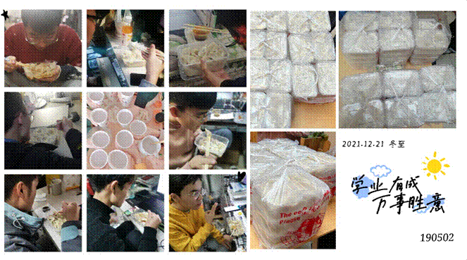 (通讯员:高原程睿)冬至是我国农历中一个重要的节气,也是中华民族的传统节日,在古代民间有“冬至大如年”的讲法。然而2021年冬至正值期末备考复习关键时期,且西安市疫情形势陡增严峻。在这种环境下,同学们难免会有压力、有紧张焦虑的情绪。为了给忙碌中的同学们加加油、鼓鼓劲,缓解同学们的压力、增强班级凝聚力,物理与sunbet申搏积极动员员工党员、入党积极分子、员工干部以多种方式自发给同学们送去温暖和关爱。190...